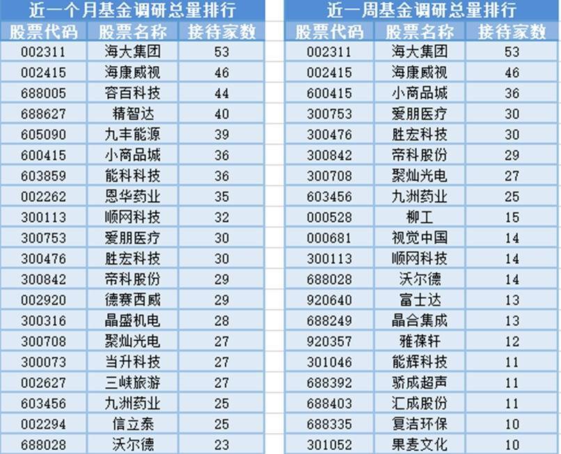 从个股调研情况上来看,最近1个月(9月21日-10月20日)最受公募基金关注的是海大集团,属于饲料行业,主营业务为饲料、优质动物种苗、动保、生猪养殖。共有53家基金管理公司参与调研,其次是海康威视和容百科技,分别接受46家、44家基金管理公司的调研。