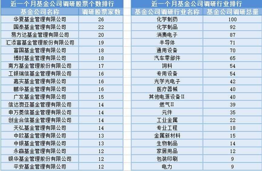 近一个月(9月21日-10月20日),华夏基金参与公司调研的数量最多,共调研26家上市公司,然后调研较为活跃的还有国泰基金、易方达基金和汇添富基金,分别调研22家、20家、19家上市公司;从调研行业上来看,基金公司对化学制药行业的上市公司调研次数最多,共有100次,其次是化学制品行业,基金公司调研了92次。